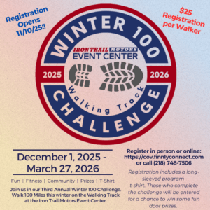 REGISTRATION OPENS November 10!! The Winter 100 Challenge is BACK! Walk 100 miles between December 1 and March 27 and be entered to win some fun prizes! It is approximately 7 laps around the Walking Track, located on the second floor of the Iron Trail Toyota Arena, to complete one mile. Registration is $25 per Walker and includes a long-sleeve program branded t-shirt. Join our Third Annual Winter 100 Walking Challenge by stopping by the office, calling (218) 748-7506, or going to: https://shorturl.at/LSDo4. Can’t wait to see you all on the Track!!